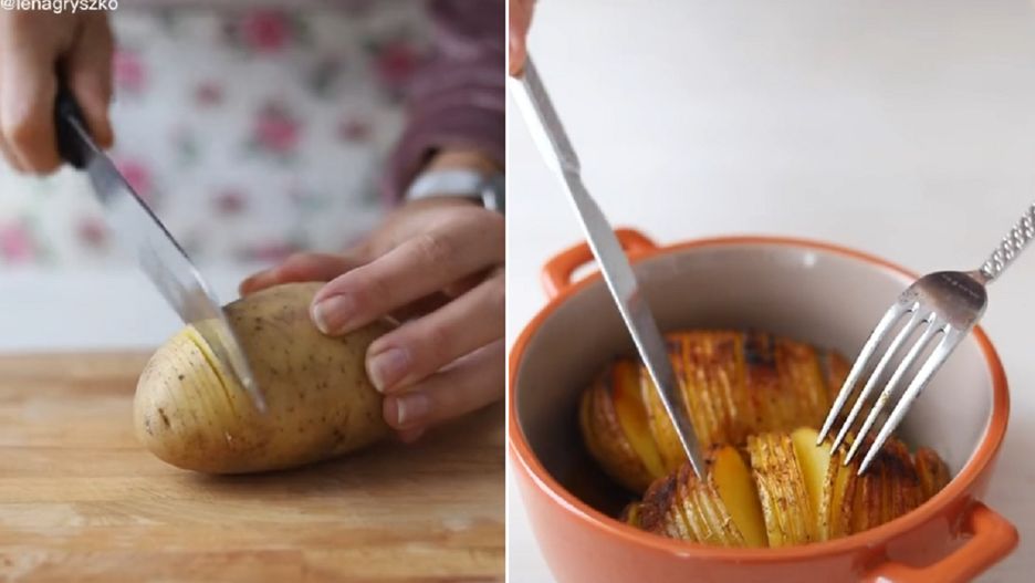 - ziemniaczki ponacinaj cienko z jednej strony, rób to ostrożnie i uważnie, by nie przeciąć warzywa całkowicie