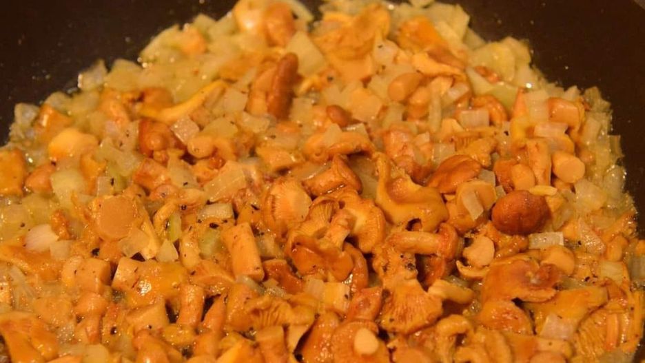 - W tym samym czasie podsmaż kurki z cebulką na 2 łyżkach masła