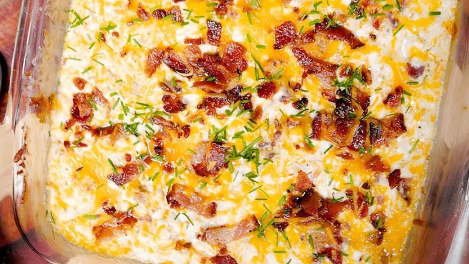 Upieczony dip dla dekoracji możesz posypać dodatkowo szczypiorkiem. Koniecznie podawaj go na ciepło. Smacznego!
