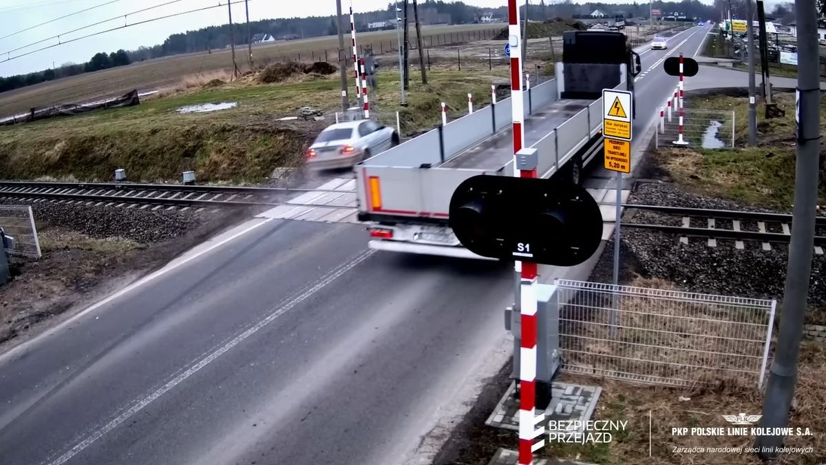 Na udostępnionym nagraniu, widzimy, jak przez strzeżony przejazd kolejowo-drogowy przejeżdżają samochody. W momencie, gdy ciężarówka zjeżdża z przejazdu, z lewej strony nagle pojawia się srebrne auto.