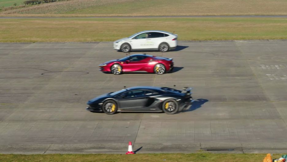 Pojedynek był dość niestandardowy, gdyż tesla zmierzyła się z ferrari oraz lamborghini.