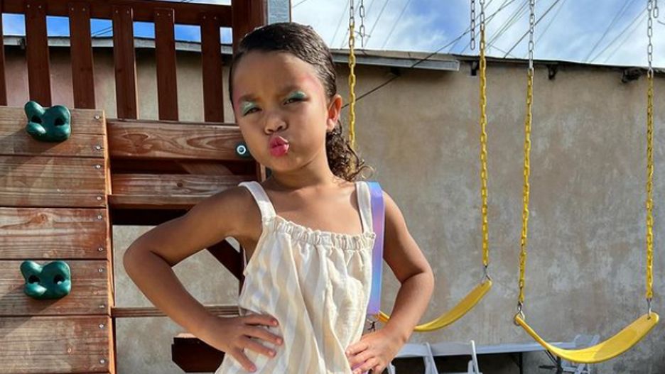 4-latka pozowała do zdjęć jak modelka, wydymając usta i kładąc dłonie na biodrach. Na innym zdjęciu przesyłała mamie buziaka, przymykając oczy, dzięki czemu lepiej widać jej makijaż: umalowane na różowo usta, turkusowy cień do powiek z brokatem pod linią brwi i różowe linie na skroni, które prawdopodobnie były próbą konturowania twarzy.