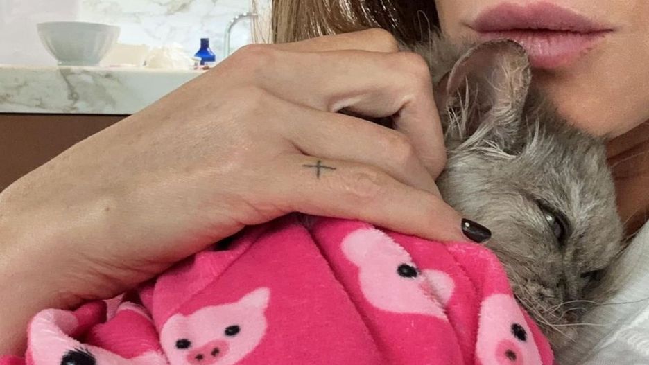 Post opatrzony jest zdjęciem, na którym widzimy kota w różowym ubranku w świnki. Leż on na klatce piersiowej aktorki.