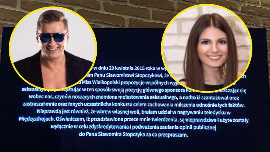 Oświadczam, że ja, Maja Nizio, w dniu 29 kwietnia 2015 roku, w wypowiedzi udzielonej w programie "Tak jest", świadomie zarzuciłam Panu Sławomirowi Stopczykowi, że składał on wobec mnie oraz innych uczestników konkursu Miss Wielkopolski propozycje wspólnych wyjazdów i ofert o charakterze seksualnym, wykorzystując w ten sposób swoją pozycję głównego sponsora konkursu i dopuszczając się wobec nas czynów noszących znamiona molestowania seksualnego, a nadto, że szantażował oraz zastraszał mnie oraz innych uczestników konkursu, celem zachowania milczenia odnoście tych faktów. Nieprawdą jest również, że wbrew własnej woli brałam udział w nagrywaniu teledysku w Międzyzdrojach. Oświadczam, iż przedstawione przeze mnie twierdzenia są nieprawdziwe i użyte zostały wyłącznie w celu zdyskredytowania i podważenia zaufania opinii publicznej do Pana Sławomira Stopczyka, za co przepraszam.