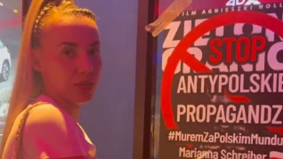 Celebrytka wybrała się do jednego z kin z plakatem, który ma zniechęcić Polaków do oglądania filmu Holland. Marianna Schreiber - podobnie jak politycy PiS - zarzucają reżyserce plucie na polski mundur.