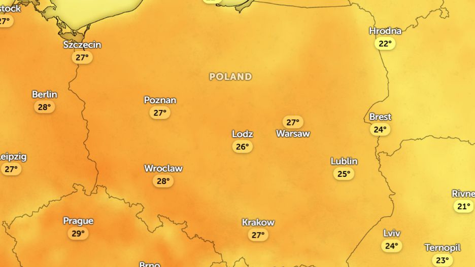 Najchłodniej będzie nad morzem – tam termometry wskażą od 19 st. C do 22 st. C. W rejonach podgórskich temperatura maksymalna wyniesie około 22°C, a na wschodzie nieco cieplej – do 23 st. C. W centrum kraju spodziewana jest temperatura w okolicach 25 st. C. Najcieplej zapowiada się na zachodzie, gdzie lokalnie może pojawić się nawet 30 st. C.