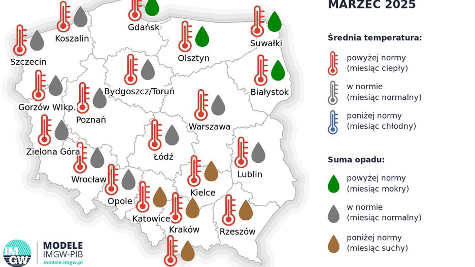 Luty 2025 w Polsce był lekko chłodny, z temperaturą o ok. 0,5 st. C niższą niż średnia z lat 1991-2020. Miesiąc ten był również wyjątkowo suchy, z minimalnymi opadami w wielu regionach. Marzec kontynuuje tę tendencję, przynosząc wyraźny niedobór opadów i cieplejsze dni.