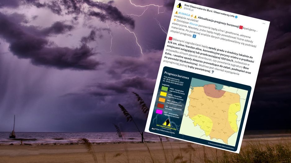 Istnieje ryzyko wystąpienia gwałtownych, miejscami niszczących burz z nawalnymi opadami i wiatrem przekraczającym w porywach 100 km/h! Możliwe również powstanie dużego układu MCS z widoczną sygnaturą Bow Echo oraz opady dużego gradu – podaje Sieć Obserwatorów Burz na platformie X.