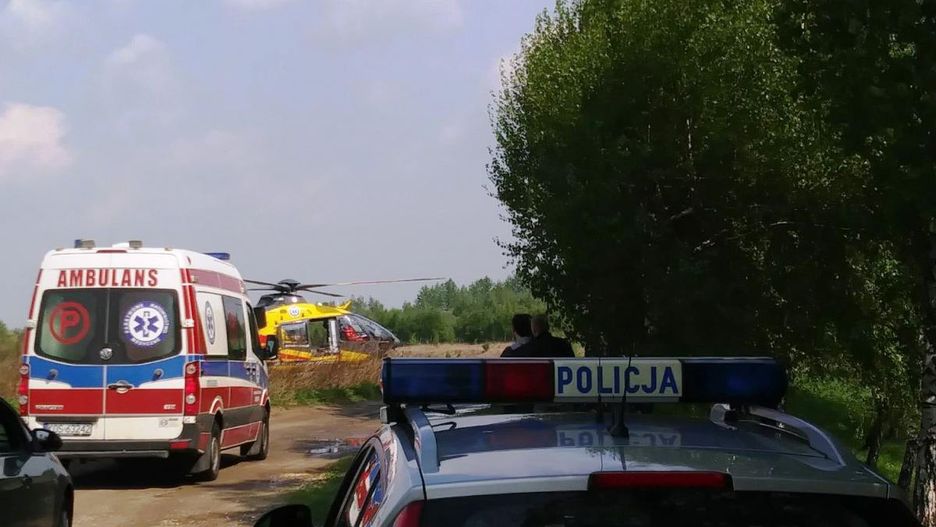 Niedługo po telefonie poparzonego na miejscu pojawili się ratownicy medyczni. Dyspozytor wezwał też na miejsce patrol drogówki. Szybko zaczęto udzielać mu pierwszej pomocy. *Stan mężczyzny określono na bardzo poważny. * Od razu wezwano Lotnicze Pogotowie Ratunkowe.