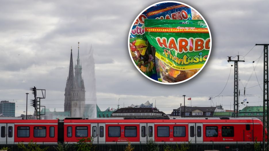A red S-Bahn Hamburg train traverses a rail line with the city's iconic skyline in the background in Hamburg, Germany, on August 28, 2022.  (Photo by Michael Nguyen/NurPhoto via Getty Images)