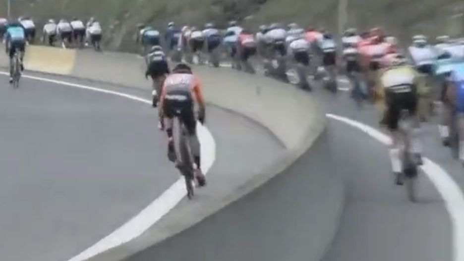 Niedługo później zaczęły się problemy. Aby wrócić na właściwą trasę, kolarze musieli przedostać się na sąsiednią jezdnię przez wysoką betonową barierę. Zobaczcie sami!