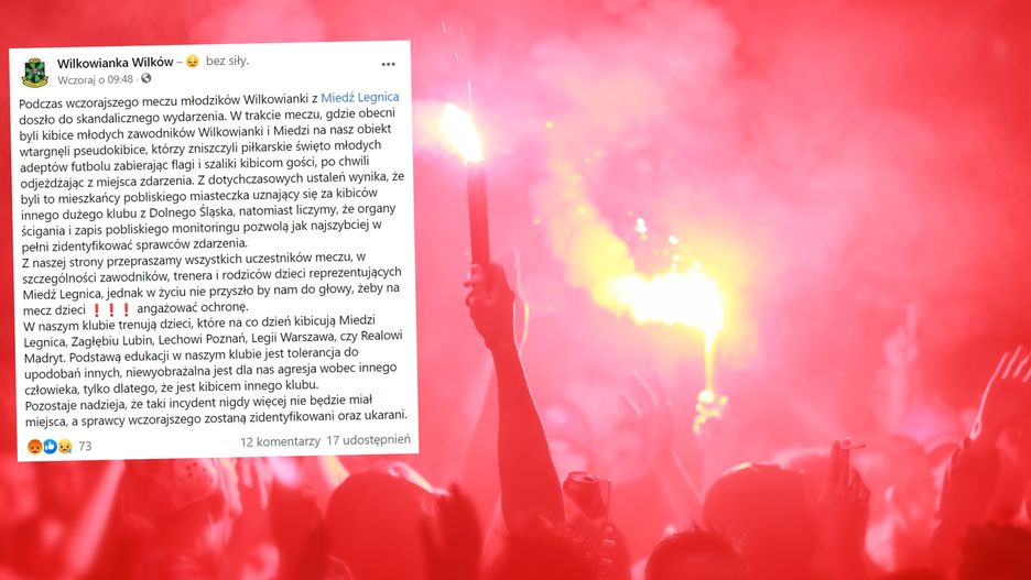 Podczas wczorajszego meczu młodzików Wilkowianki z Miedź Legnica doszło do skandalicznego wydarzenia. W trakcie meczu, gdzie obecni byli kibice młodych zawodników Wilkowianki i Miedzi na nasz obiekt wtargnęli pseudokibice, którzy zniszczyli piłkarskie święto młodych adeptów futbolu, zabierając flagi i szaliki kibicom gości, po chwili odjeżdżając z miejsca zdarzenia. Z dotychczasowych ustaleń wynika, że byli to mieszkańcy pobliskiego miasteczka uznający się za kibiców innego dużego klubu z Dolnego Śląska, natomiast liczymy, że organy ścigania i zapis pobliskiego monitoringu pozwolą jak najszybciej w pełni zidentyfikować sprawców zdarzenia. Z naszej strony przepraszamy wszystkich uczestników meczu, w szczególności zawodników, trenera i rodziców dzieci reprezentujących Miedź Legnica, jednak w życiu nie przyszło by nam do głowy, żeby na mecz dzieci angażować ochronę - napisano w oświadczeniu.