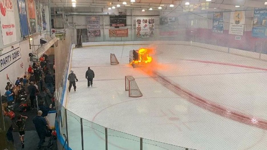 Przerażające sceny podczas treningu hokeja na lodzie. Podczas przerwy zapaliła się maszyna do czyszczenia lodu. Kierowca zachował zimną krew i mimo zagrożenia wyprowadził pojazd z budynku.