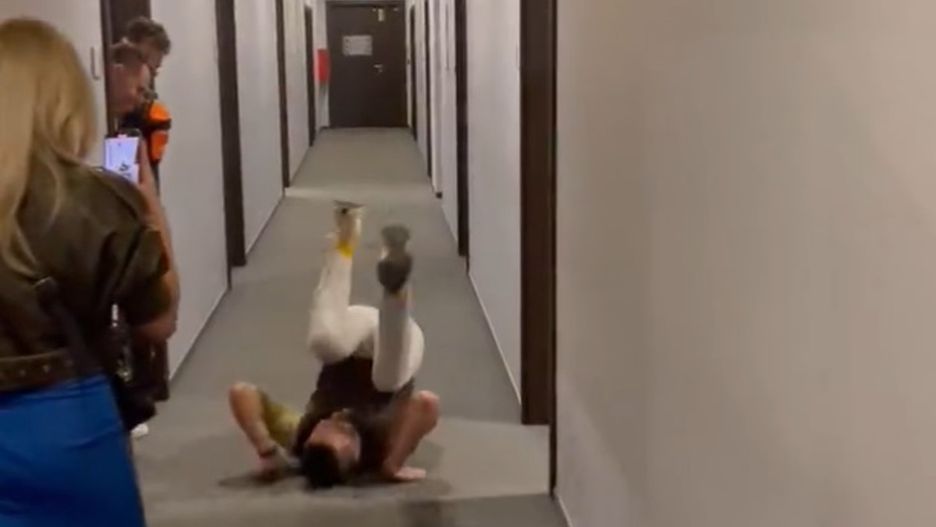 Krótkie nagranie pokazuje, że najmocniej "odpiął wrotki" Jakub Bednaruk. Komentator i ekspert Polsatu był w przeszłości rozgrywającym oraz trenerem. Bednaruk złożył się do trzech przewrotów na korytarzu stacji. W pewnym momencie nieomal staranował jednego ze współpracowników, a zakończył wszystko telemarkiem znanym ze skoczni narciarskich.