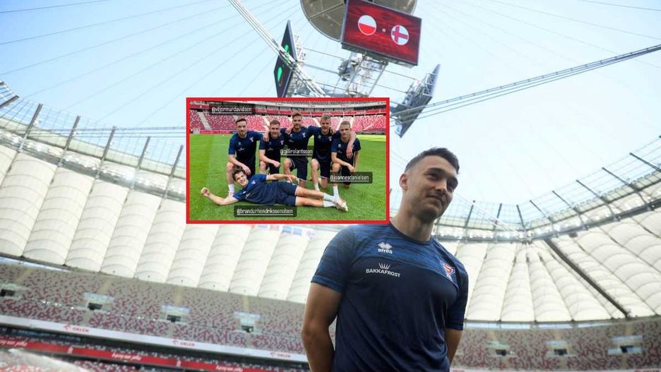 Dzień przed meczem zawodnicy z Wysp Owczych trenowali w miejscu akcji. Zanim założyli buty piłkarskie, postanowili zrobić sobie małą sesję fotograficzną na boisku czy na ławce rezerwowych.