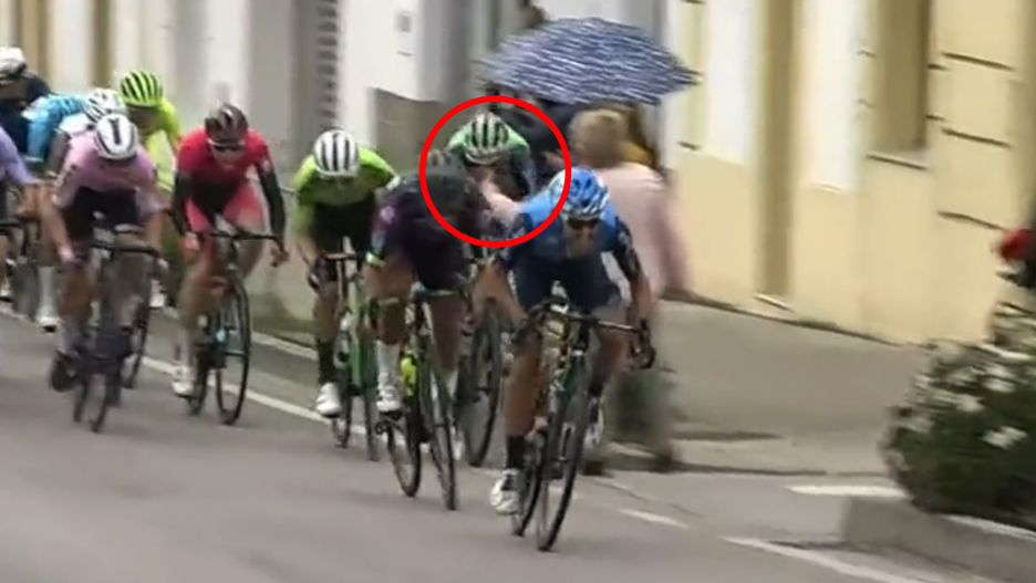 Jedna z fanek stojących przy trasie podeszła zbyt blisko kolarzy. Wyciągnęła telefon, chcąc nagrać przejeżdżający peleton. Zahaczyła jednego z zawodników, powodując jego groźnie wyglądający upadek.