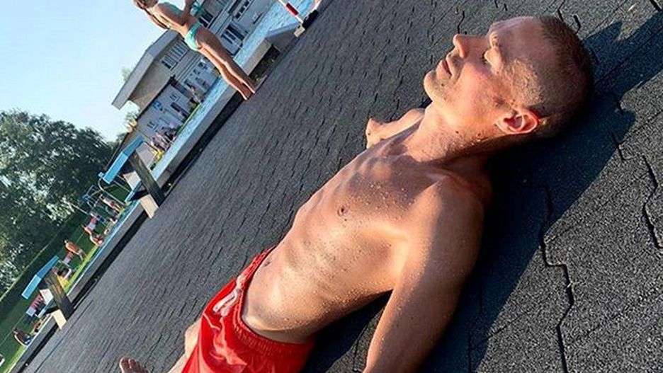 Na zdjęciu widzimy Piotra Żyłę, leżącego na ziemi w pobliżu basenu. "Rylax" - czytamy w opisie fotografii. Internautów najbardziej zaskoczyła jednak oznaczona lokalizacja.