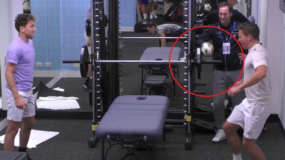 Casper Ruud zagrał w coś przypominającego mieszankę siatkonogi z teqballem. Do rozgrywki wykorzystał ławeczkę do wyciskania sztangi. Piłka była zdecydowanie mniejsza niż te wykorzystywane w meczach na dużym boisku.