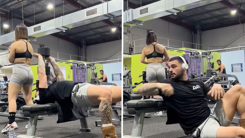 Na nagraniu widać, jak Stratis wziął w dłonie hantla i oparł się na ławce, by wykonać serię podnoszeń. Plecami do niego ustawiła się kobieta, która również z hantlem w ręku, zamierzała robić przysiady.