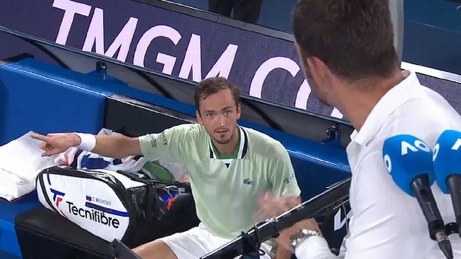 Rosyjski as wezwał sędziego, aby ten udzielił Stefanosowi Tsitsipasowi ostrzeżenia za zachowanie jego ojca podczas meczu. Miedwiediew, który przegrał seta 4:6, był sfrustrowany. Jego zdaniem Apostolos Tsitsipas stosował tzw. "coaching", podpowiadając z trybun.