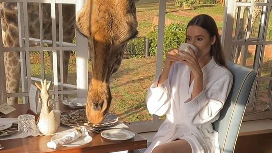 Żona polskiego piłkarza, siedząc w pięknym białym szlafroku, popija sobie poranną kawę. Tuż obok jej ramienia żyrafa wcina smakołyki z talerza. Wszystko zostało nagrane. Spójrzcie:
