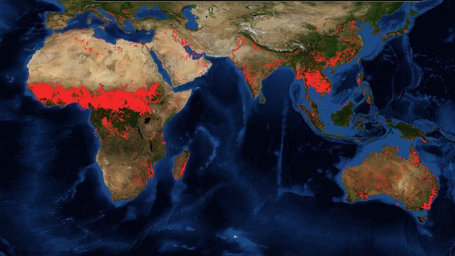 Zdjęcie przedstawia sytuację z ostatnich 7 dni (od 31 grudnia 2019 do 7 stycznia 2020 roku). Czerwone punkty informują o występowaniu pożarów. Jak widać nie tylko Australia jest miejscem, które mierzy się z ogromną liczbą pożarów. Pod tym względem cierpi również środkowa część Afryki.