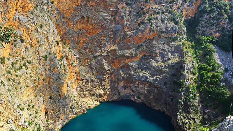Drugie miejsce na liście zajmuje Crveno Jezero (Czerwone Jezioro). Mówimy o jeziorze krasowym, które powstało w wyniku zawalenia się jaskiń w pobliżu miasta Imotski w Chorwacji. Co prawda samo jezioro ma niebieski kolor, ale jego nazwa pochodzi od otaczających go czerwono-brązowych skał, które zostały zabarwione tlenkami żelaza. Zapadlisko ma 530 m głębokości i wyróżnia się unikalnymi gatunkami ryb.