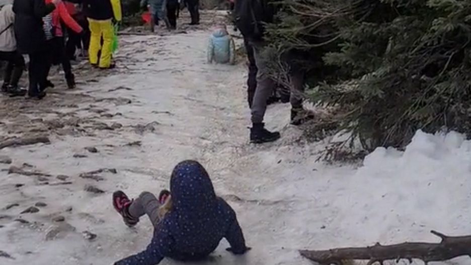 Swoim nagraniem ze Śnieżki podzielił się też internauta o nicku wakacyjny34. Mężczyzna nagrał, jak turyści przewracają się i zjeżdżają z oblodzonej ścieżki. Jedna z osób próbuje zejść trzymając się gałęzi drzew. Widać też, że mija go kilka osób w raczkach.