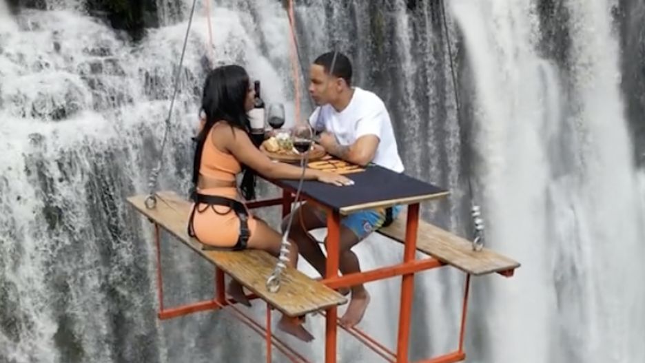 Patrząc na niektóre materiały w sieci, można śmiało powiedzieć, że klasyczna romantyczna kolacja w ekskluzywnej restauracji odchodzi do lamusa. Ta para postanowiła zjeść w Brazylii lunch... w powietrzu. Za plecami biesiadników widać zaś rwący strumień wodospadu.