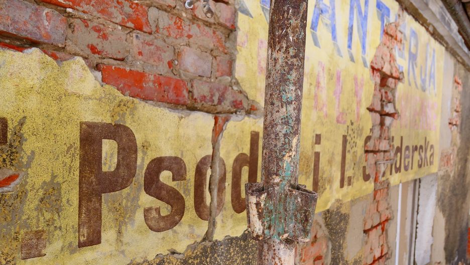 "Galanterja. Materiały piśmienne. T. Psoda i I. Świderska" - brzmi hasło wymalowane na ścianie. Język wskazuje, że napis może pochodzić z czasów przedwojennych lub powstał krótko po II wojnie światowej.