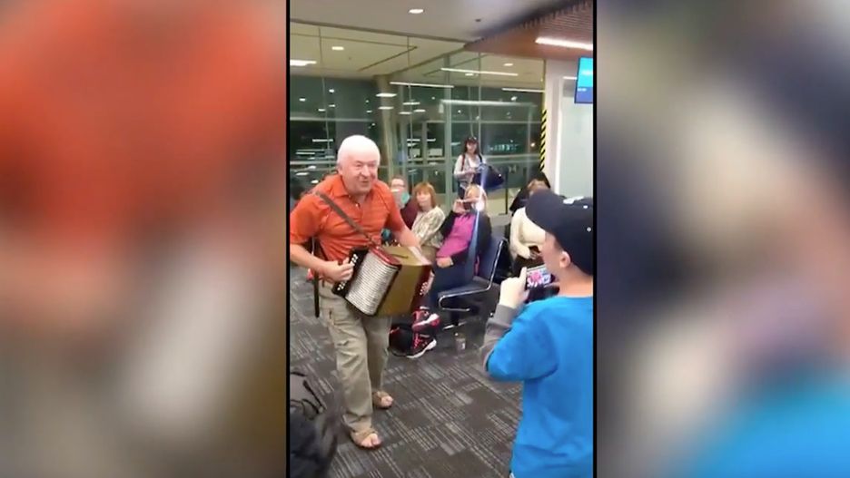 Akordeony i gitara wystarczyły, by poruszyć całą poczekalnię. Pasażerowie, którzy również musieli spędzić dodatkową godzinę w oczekiwaniu na lot, wydawali się być zachwyceni sytuacją.