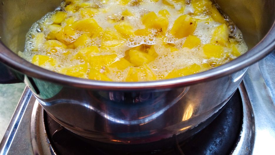 Na początek obieramy ananasa ze skórki, dokładnie myjemy i kroimy na mniejsze kawałki, które wrzucamy do garnka z wodą. Skórki z ananasa nie warto wyrzucać do kosza. Będzie się nadawać do zrobienia kolejnej porcji.